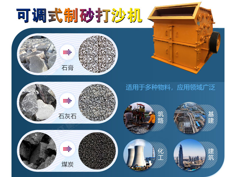 1612可調(diào)式打沙機廣泛應用于鐵路建設、公路建設、市政建設、水泥廠、建材業(yè)、陶瓷業(yè)、化工等領域,破碎石灰石、石膏、白堊、煤、明礬等中硬及較軟物料